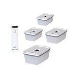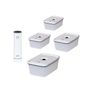 Pompe sous vide + 4 boîtes Smart. Pratique et silencieuse, cette pompe au design élégant, moderne et compact vous permet de mettre sous vide vos aliments ou vos restes de plat pour les conserver plus longtemps! Facile à utiliser : la pompe extrait l'air en quelques secondes en appuyant sur le bouton unique. Le processus de mise sous vide s'arrête automatiquement lorsque le vide approprié est atteint. Sans fil. Rechargeable par câble USB inclus. Batterie lithium-ion longue durée. Boîte en plastique polypropylène et couvercle avec joint silicone et valve de mise sous vide. Le processus de vidage s'arrête automatiquement dès que le vide adéquat est obtenu. Ces boîtes sont empilables et compatibles micro-ondes, réfrigérateur, congélateur et lave-vaisselle.