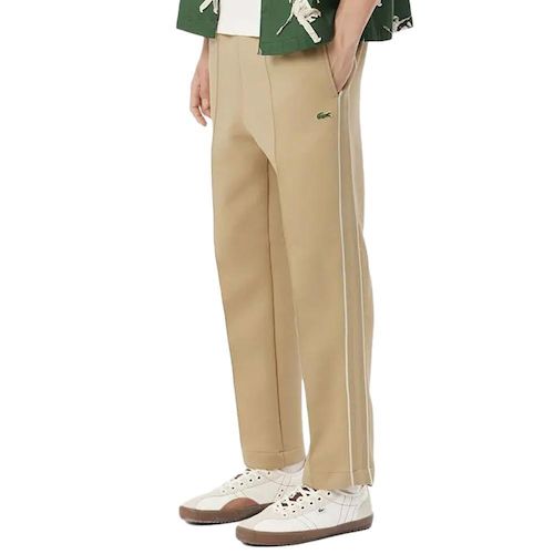 Craquez pour le jogging de la marque LACOSTE !Coloris : Beige Double-face jersey fabric made from organic cotton and recycled polyesterRegular fit, straight cutMesh bands down leg with contrast trimStitched pleats on frontEmbroidered crocodile on left legFit RegularCoton (90%), Polyester (10%)