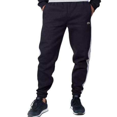Optez pour ce jogging de la marque LacosteComposition : 100% cotonColoris : NoirComposition : 80% Coton, 20% PolyesterBandes grises sur les côtés c