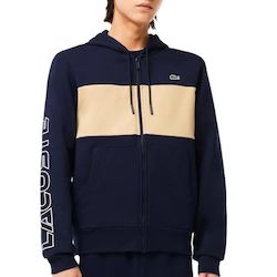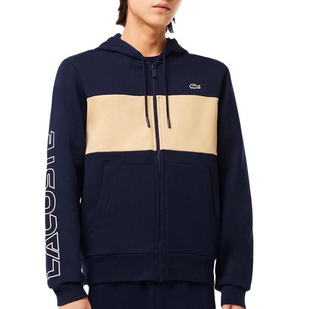 Optez pour le sweat homme de la marque Lacoste !- Manches longues- Capuche- Inscription sur la manche- Coloris : Marine/Beige- Fermeture à zip- 2 poches- Logo brodé- Composition : 100% coton