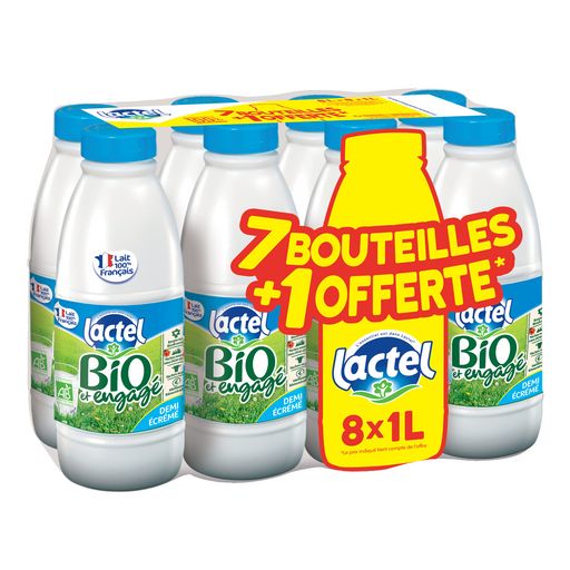 Lait demi-écrémé issu de l'agriculture biologique stérilisé UHT Savez-vous pourquoi Lactel Bio et Engagé est si bon ? C’est pour plein de bonnes raisons : - Des vaches au pré dès que le temps le permet* et ateliers de formations au bien-être animal pour les éleveurs. - Des vaches bien nourries, en privilégiant une alimentation biologique et garantie sans OGM (<0.9%)*. - Dans un environnement qui respecte la biodiversité avec la plantation de haies. - Et une meilleure rémunération des éleveurs. Retrouvez tous les engagements Lactel Bio et Engagé sur Lactel.fr. *Conformément à la réglementation relative à la production Biologique.