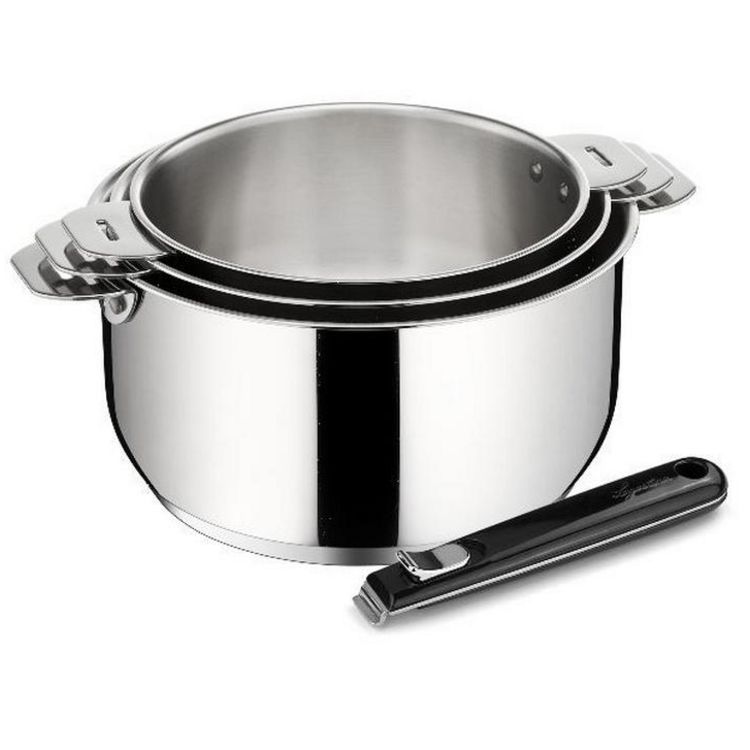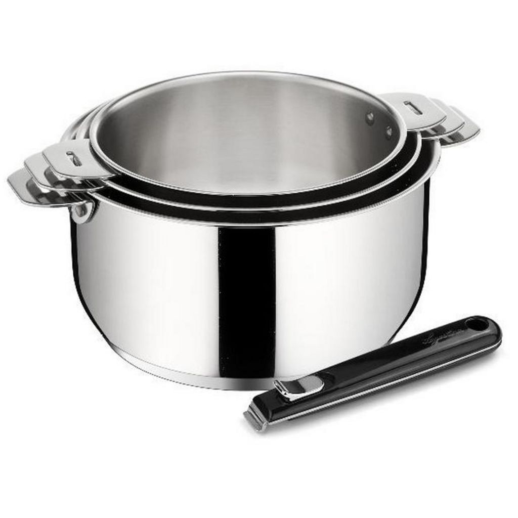 Lagostina 012132600004 Série de 3 casseroles + poignée Salvaspazio Lagostina 012132600004 en inox 18/10 durable et élégant. L'ingéniosité en un clic ! Cette gamme a été pensée pour vous faciliter la vie et la cuisson. Des poignées et des anses ingénieuses et robustes qui se montent et se démontent en un clic. Des ustensiles de cuisson qui s'empilent pour un gain de place évident et un rangement facile. L'élégance n'a jamais été aussi pratique ! Polissage extérieur effet miroir : meilleure résistance à la corrosion et nettoyage facile. Fond LagoSeal® épais (5 mm d'épaisseur) : une capsule en inox remplie d'aluminium frappée sur le fond de l'ustensile permet une montée en température rapide et une diffusion homogène de la chaleur. Intérieur inox satiné. Supports de poignées rivetés pour une plus grande robustesse. Passe au four jusqu'à 250°C (sans poignée ni couvercle), au réfrigérateur, au lave-vaisselle ou sur votre table grâce à leurs manches ou anses déclipsables livrés séparément. Les poignées et anses amovibles se manipulent d'une seule main et se verrouillent automatiquement : l'assurance d'avoir des poignées toujours froides en cours de cuisson et de pouvoir passer facilement de la plaque de cuisson au four puis à la table. Livré avec 1 poignée nouvelle génération : plus ergonomique, avec verrouillage automatique pour une utilisation d'une seule main, bords arrondis pour faciliter le glissement et avec une accroche parfaite garantie sans jeu entre la poignée et la cuve. Nettoyage facile : passe au lave-vaisselle.