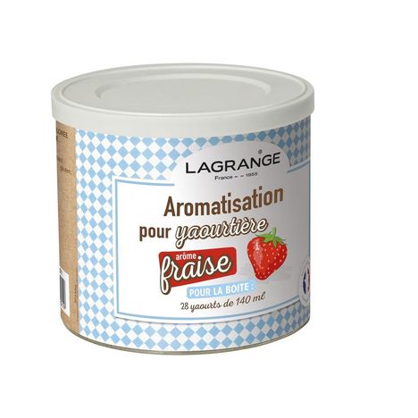 Lagrange 380320 Aromatisation pour yaourtière fraise 380320 de Lagrange pour réaliser de délicieux yaourts en yaourtière.PratiqueLes aromatisastions sont conçues spécialement pour faire des yaourts aromatisés en yaourtière, de façon simple et rapide.Capacité adaptéeBoîte de 500g avec couvercle souple et bec verseur pour permettre de réaliser des yaourts aromatisés dans la yaourtière Lagrange capacité 7 pots, la nouvelle yaourtière Lagrange capacité 9 pots et également dans les yaourtières concurrentes.Facile d'utilisationIl suffit d'ajouter à votre yaourt et votre lait de 6 à 8 cuillères à soupe d'aromatisation pour réaliser 7 pots de yaourt de 140 ml et de 8 à 10 cuillères à soupe d'aromatisation pour réaliser 9 pots de yaourts de 140 ml (ce qui permettra de réaliser 4 fournées de 7 pots et 3 fournées de 9 pots).Gournands7 référenecs d'arômes lactés et gourmands et d'arômes délicieusement fruités.