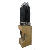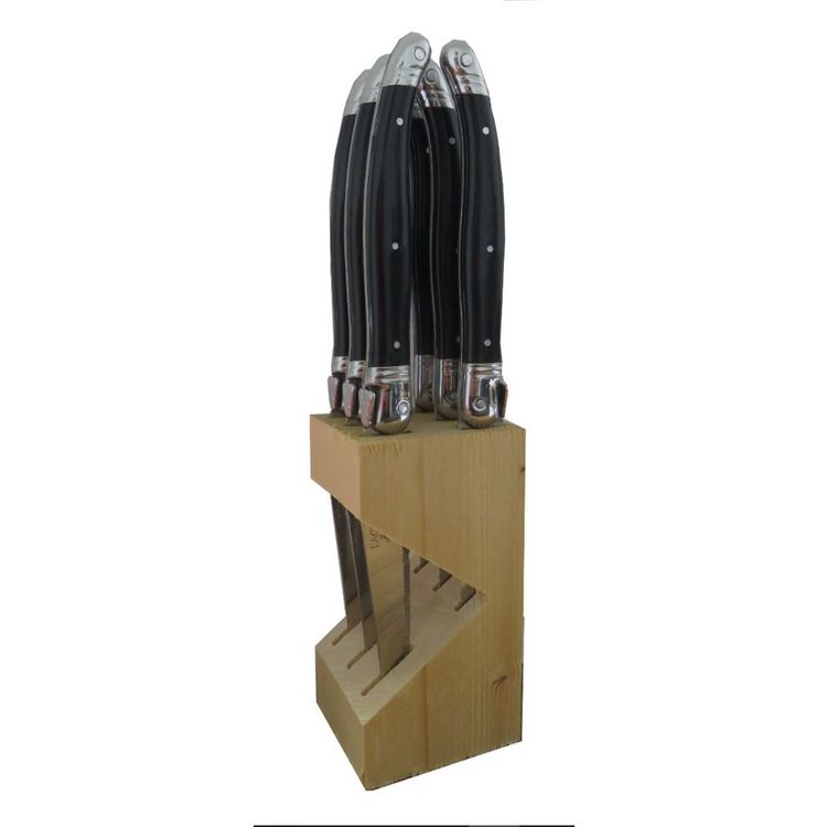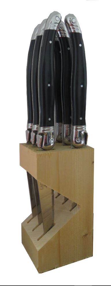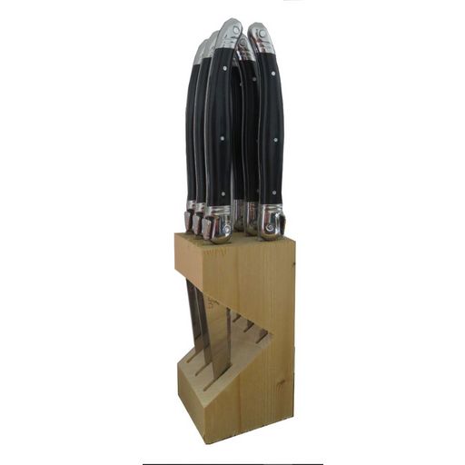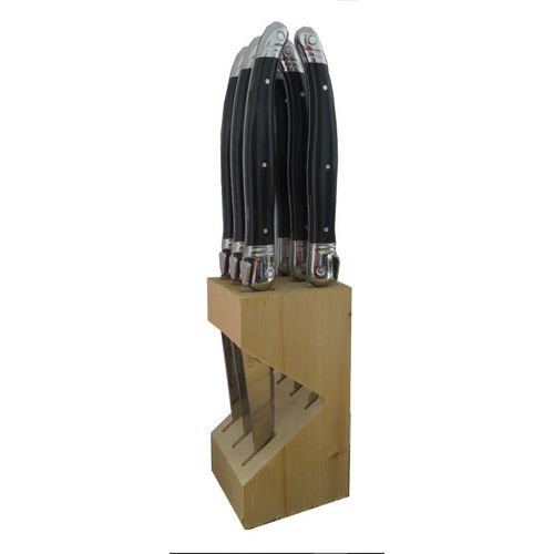 Découvrez ce bloc de 6 couteaux LAGUIOLE. 100% fabrication française. Lames microdentées en acier inox épaisseur 1,2 mm. Présentés dans un bloc en bois naturel. Vous pourrez découper vos viandes en toute facilité.