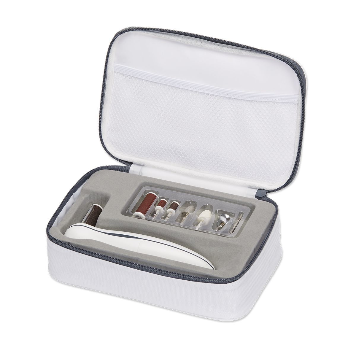 L’appareil possède 6 embouts interchangeables pour modeler, limer et lisser vos ongles, et pour réduire certaines callosités et éliminer les peaux mortes des pieds. Sa pochette de rangement facilite le rangement et vous permet de l’emporter n’importe où.