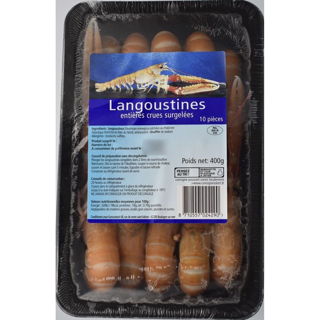 Langoustines Nephrops norvegicus (CRUSTACES) 99,85%, antioxydant: sisulfite de sodium (SULFITES) (0,15% max)