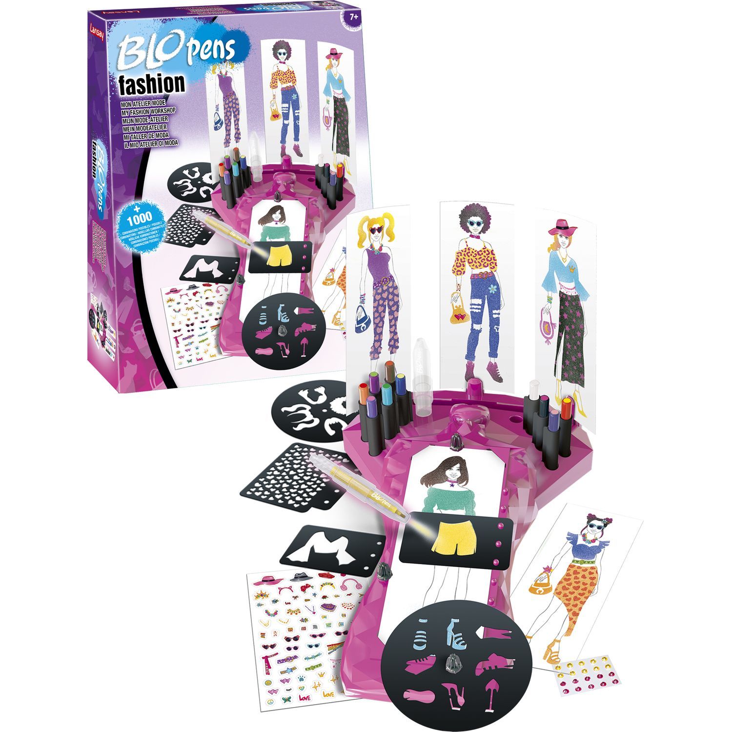 - 1 atelier de mode, 10 Mini Blopens bicolores, 1 Mini Blopens magique, 20 pochoirs, 20 modèles, 1 planche d’autocollants, 1 planche de strass.