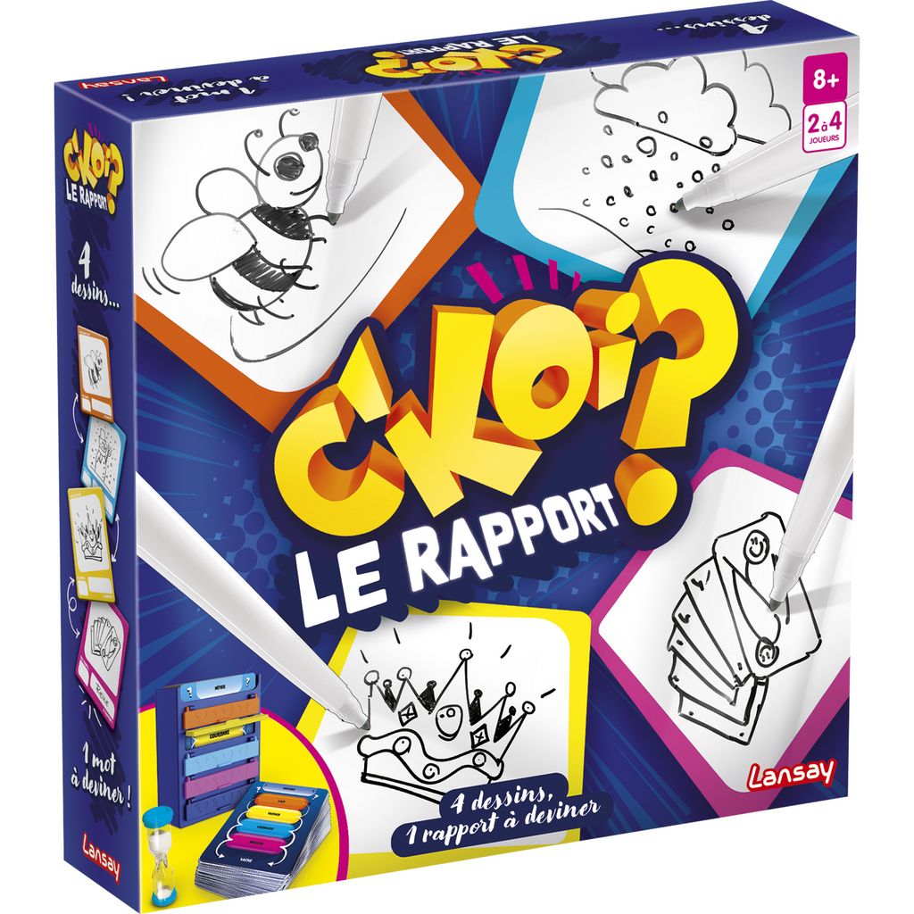 Découvrez le mot correspondant à votre couleur puis dessinez-le sur votre ardoise. Après 30 secondes, rassemblez vos 4 ardoises au centre de la table et tentez de deviner le rapport entre les 4 dessins ! Le premier qui obtient 10 cartes a gagné ! Mais à partir de 5 cartes, d’autres défis vous attendent : saurez-vous dessiner avec un bras derrière le dos ? Ou peut-être avec la bouche ?2 niveaux de difficulté200 rapports à trouverJeu d’ambiance.2 à 4 joueurs.
