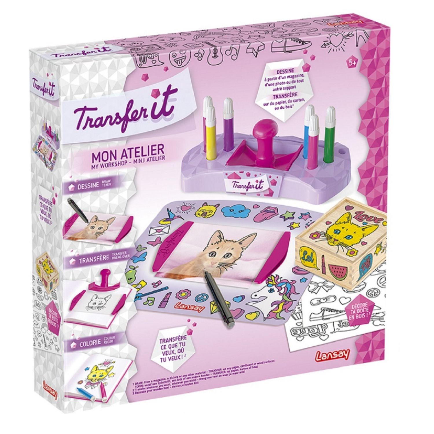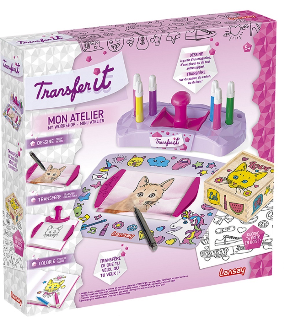 Grâce à ton atelier transfer It, transfère tout ce que tu veux, où tu veux ! Sélectionne l'image de ton choix, superpose ta feuille de transfert et dessine les contours. Retourne ta feuille de transfert, place-la sur le support de ton choix, et appuie avec ton tampon pour découvrir ta création ! Il est possible de transférer tes dessins sur n'importe quelle surface en papier, en carton et même en bois ! Laisse libre cours à ton imagination et réalise des créations uniques pour impressionner tes amis !