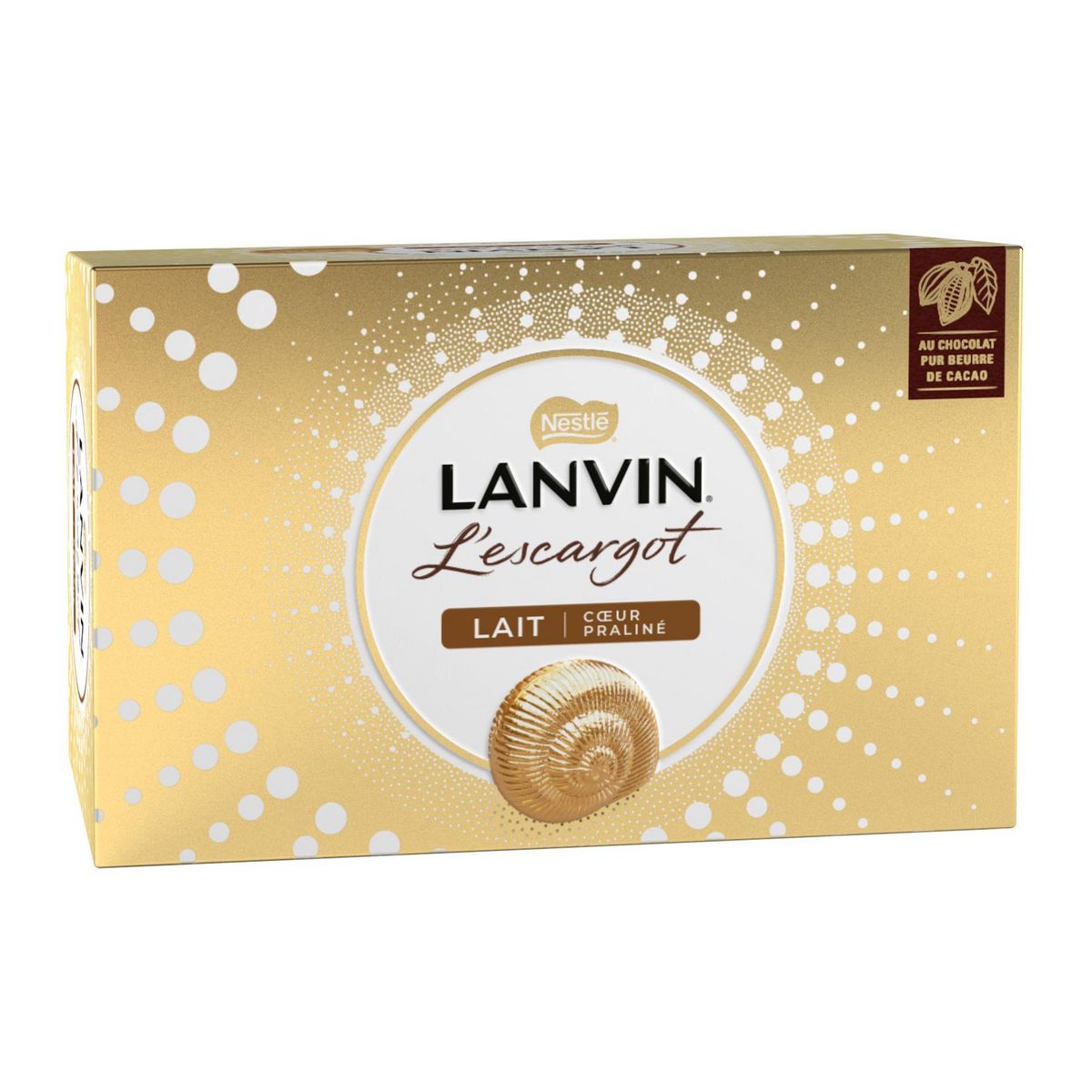 Créé en 1934 en Bourgogne, l'Escargot LANVIN vous séduira par son praliné onctueux né de la torréfaction des amandes et noisettes et par sa coque de délicieux chocolat au lait. L'inimitable praliné Lanvin se dévoile… Ce praliné riche, fruité, onctueux en bouche et fondant au palais est composé d'un mélange savamment dosé d'amandes et de noisettes sélectionnées, délicatement grillées afin de sublimer les arômes en bouche… Avec le Plan Cacao NESTLE, et en partenariat avec Rainforest Alliance, LANVIN s'engage pour une production plus durable de cacao et contribue à soutenir les cultivateurs et leurs communautés.