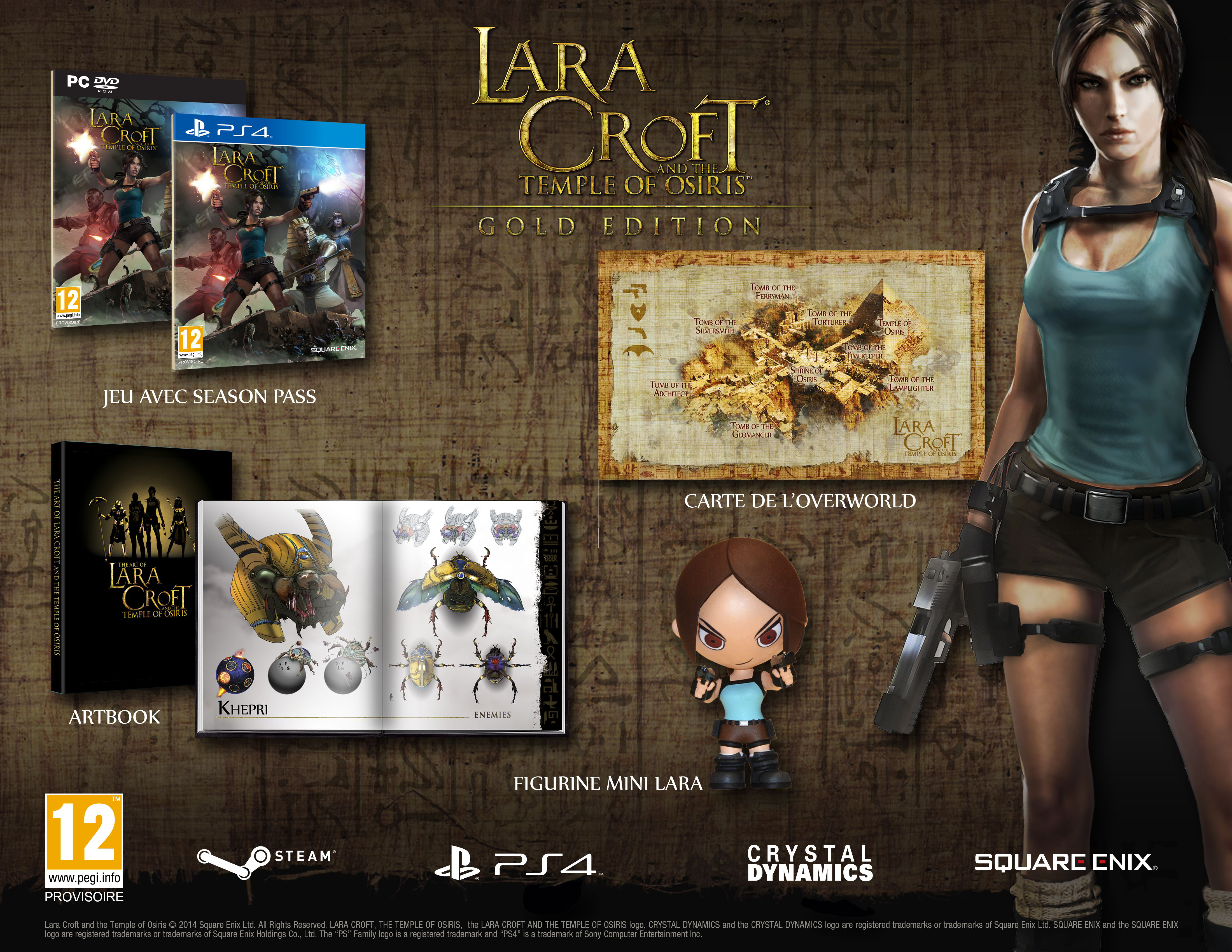 Inclus dans Lara Croft and the Temple of Osiris Gold Edition : Le jeu, un Season Pass, un Artbook, une Carte de l’Overworld et une Figurine Mini Lara.
