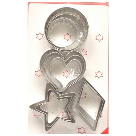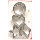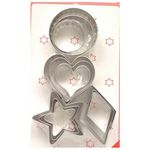 Lares 1039 - Matière : Fer blancNombre : 12 découpoirsDimensions : 3 à 6 cm4 formes possibles : étoile, coeur, losange, rond
