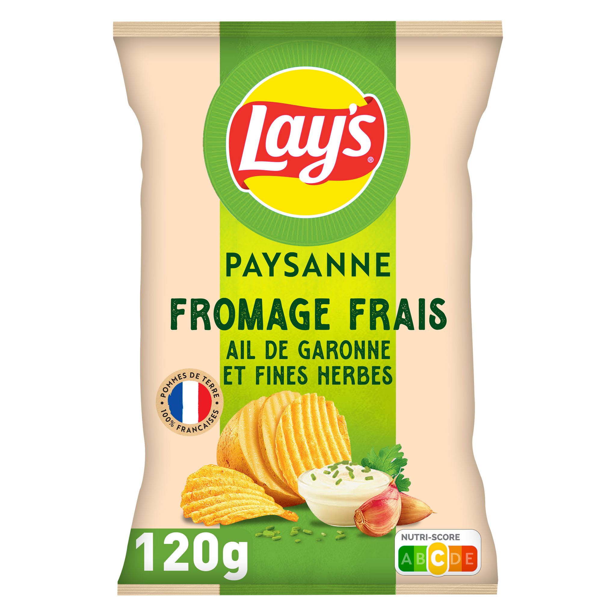 LAY'S PAYSANNE SAVEUR FROMAGE FRAIS, AIL & FINES HERBES : Des chips ondulées avec une saveur inspirée du terroir. Découvrez le goût unique du fromage frais associé à l'intensité du de l'ail de Garonne et de ses fines herbes. UN SAVOIR-FAIRE TRADITIONNEL : Craquez pour la générosité des chips Lay's Recette Paysanne ! De grandes chips ondulées, épaisses, terriblement croquantes et au bon goût de pomme de terre. DES CHIPS FRANÇAISES : Notre gamme Lay's Recette à l'Ancienne est entièrement produite à partir de pommes de terre 100% Françaises. Nous sommes fiers de collaborer avec nos agriculteurs Français et de mettre leur savoir-faire agricole au service de notre expertise de la chips.