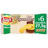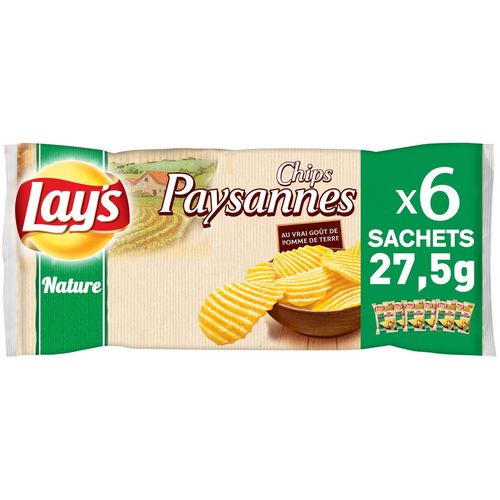 Chips de pommes de terre paysannes goût nature C'est grâce à son svoir-faire que Lay's® contribue à vous offrir des chips paysannes croquantes et gourmandes au vrai goût de pomme de terre. Des chips épaisses et craquantes Une coupe ondulée D'épaisses tranches de pommes de terre Un goût exceptionnel Une recette simple et authentique 3 ingrédients seulement ! Pommes de terre Huiles Sel ✓ Sans huile de palme* ✓ Sans colorant artificiel ✓ Sans conservateur *Pour plus d'informations, consulter www.lays.fr Des chips de qualité depuis 1932 1. Des pommes de terre soigneusement sélectionnées. 2. Une fabrication de qualité. 3. Un sachet protecteur. Ces pommes de terre sont Sélectionnées - Lavées - Pelées - Frites - Assaisonnées - Emballées