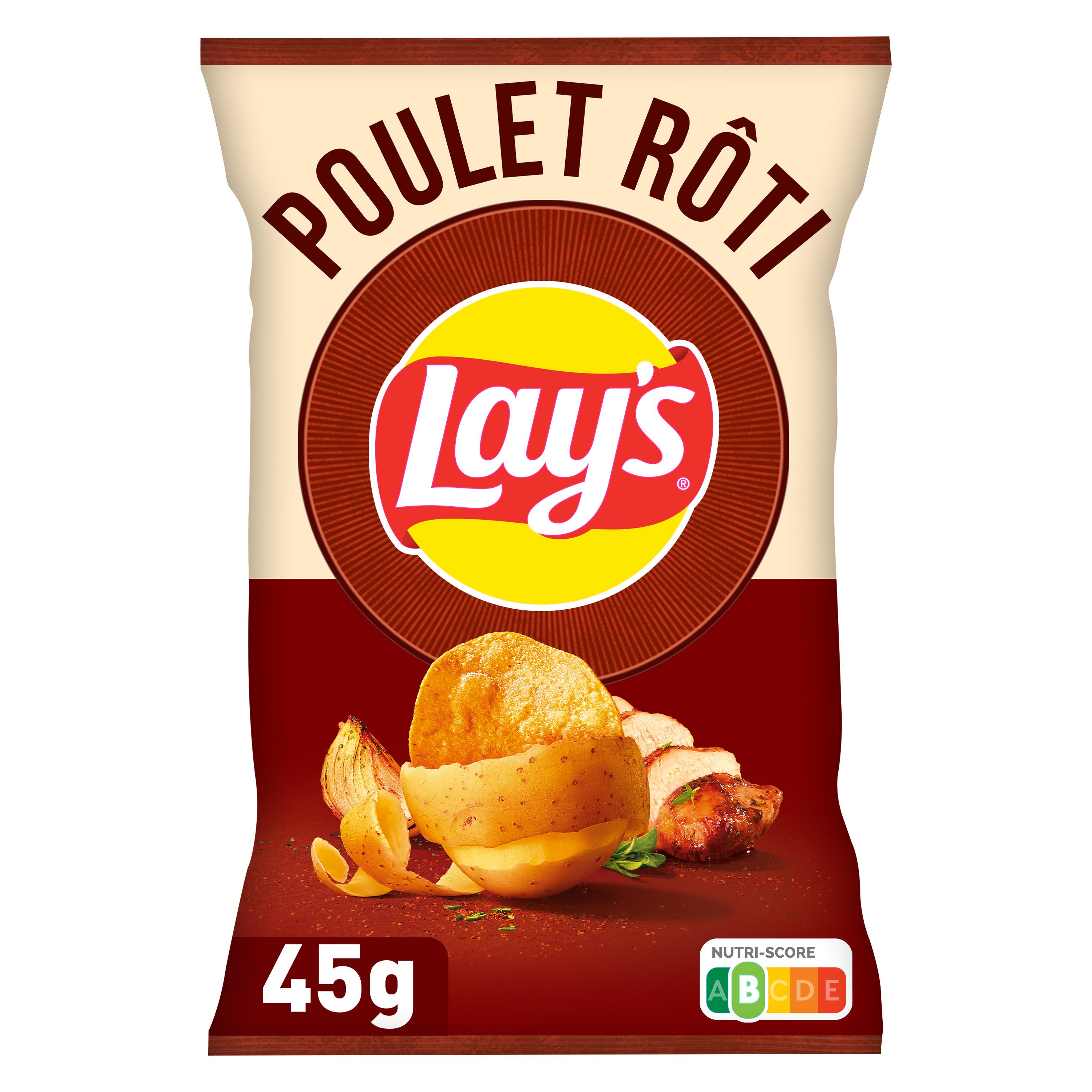 Ingrédients : pommes de terre, huiles végétales (tournesol, colza en proportion variable), base aromatisante poulet rôti [sucre, chlorure de potassium, sel, arômes, oignon en poudre, sauge, acidifiant (acide citrique), colorant (extrait de paprika)], antioxydants (extraits de romarin, acide ascorbique, extrait riche en tocophérols, acide citrique).