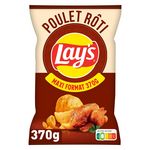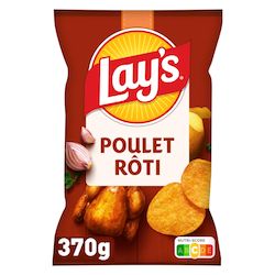 Ingrédients : pommes de terre, huiles végétales (tournesol, colza en proportion variable), base aromatisante poulet rôti [sucre, chlorure de potassium, sel, arômes, oignon en poudre, sauge, acidifiant (acide citrique), colorant (extrait de paprika)], antioxydants (extraits de romarin, acide ascorbique, extrait riche en tocophérols, acide citrique).