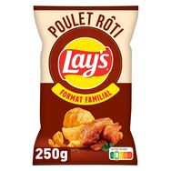 Ingrédients : pommes de terre, huiles végétales (tournesol, colza en proportion variable), base aromatisante poulet rôti [sucre, chlorure de potassium, sel, arômes, oignon en poudre, sauge, acidifiant (acide citrique), colorant (extrait de paprika)], antioxydants (extraits de romarin, acide ascorbique, extrait riche en tocophérols, acide citrique).