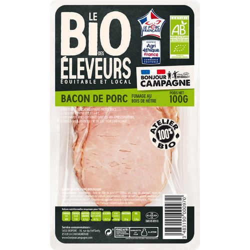 Ingrédients : noix de filet de porc*(90%), sel, sirop de glucose*,sucre de canne*, antioxydant: ascorbate de sodium, conservateur:nitrite de sodium,ail*, huile essentielle de poivre*