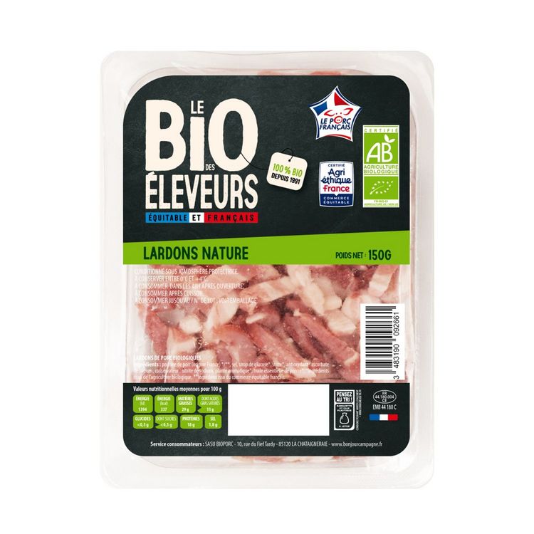Bio c’est bien mais déçue par la qualité. En effet au visuel des morceaux très gras, et la cuisson a confirmé : mes lardons nageaient dans la graisse