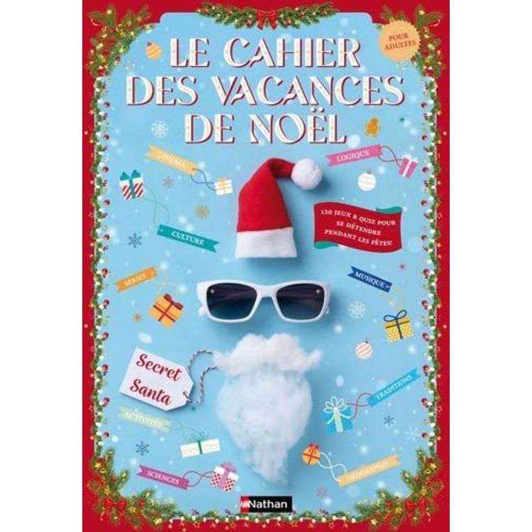 La parfaite pause détente pendant les fêtes ! Le cadeau idéal pour un Secret Santa ! Vous êtes plutôt team pull moche, Secret Santa, tisane au coin du feu, soirée paillettes en concert ou glisse extrême ? Dans ce cahier, il y en a pour tout le monde ! Plongez dans la magie des fêtes avec ce cahier de vacances ludique spécialement conçu pour les adultes. Jouez à tester vos connaissances en musique, cinéma, séries, traditions, cuisine, logique, géographie, histoire... le cahier parfait à offrir ou à s'offrir pour se détendre au coin du feu ou entre deux repas en famille, seul ou entouré ! Idéal et original en petit cadeau dernière minute et Secret Santa