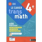 Cahier Transmaths pour les élèves de 4e : un cahier de mathématiques bi-média réunissant le meilleur du papier et le meilleur du numérique conforme aux programmes officiels et aux repères de progressivité Une méthode qui propose de combiner outils papier et numérique : un cahier d'activités pour s'entraîner et garder une trace écrite la plateforme Biblio Exos pour s'autoévaluer et vérifier les acquis Le cahier Transmath 4e, c'est aussi : - Plus de 600 exercices différenciés signalés par , , pour maîtriser les bases, s'entraîner et se perfectionner. - De nombreux exercices d'algorithmique pour s'entraîner avec Scratch . - Des tâches complexes proposant des situations favorables à la résolution de problèmes et à la pratique d'une démarche scientifique. - Tous les corrigés disponibles dans le cahier numérique enseignant, à distribuer à vos élèves pour les faire travailler en autonomie.