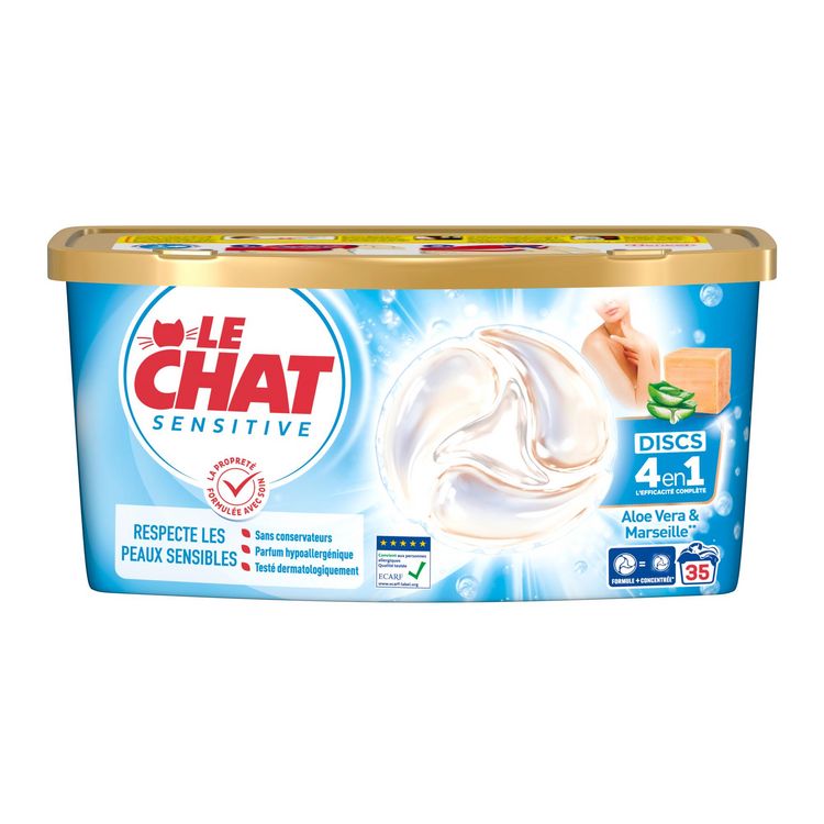Le Chat s'engage à faire toujours mieux pour ce qui vous tient à cœur, en vous garantissant : - Toute l'efficacité Le Chat -Des ingrédients sélectionnés avec soin - Une formule sans conservateurs MIT ni BIT* et un parfum hypoallergénique. /Le Chat Discs Sensitive Savon de Marseille & Aloe Vera* vous garantit un linge propre tout en respectant les peaux sensibles, grâce à sa formule développée avec des dermatologues./*Parfum de synthèse