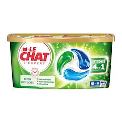 Le Chat s'engage à faire toujours mieux pour ce qui vous tient à cœur, en vous garantissant : - Toute l'efficacité Le Chat - Des ingrédients sélectionnés avec soin - Une formule sans conservateurs - Un parfum hypoallergénique .Le Chat Discs L'Expert, la capsule 4en1, qui vous assure une performance complète et sans effort, laissant votre linge frais et impeccable, même lavé à basse température. Parfum hypoallergénique : formulé pour minimiser les risques de réactions allergiques.