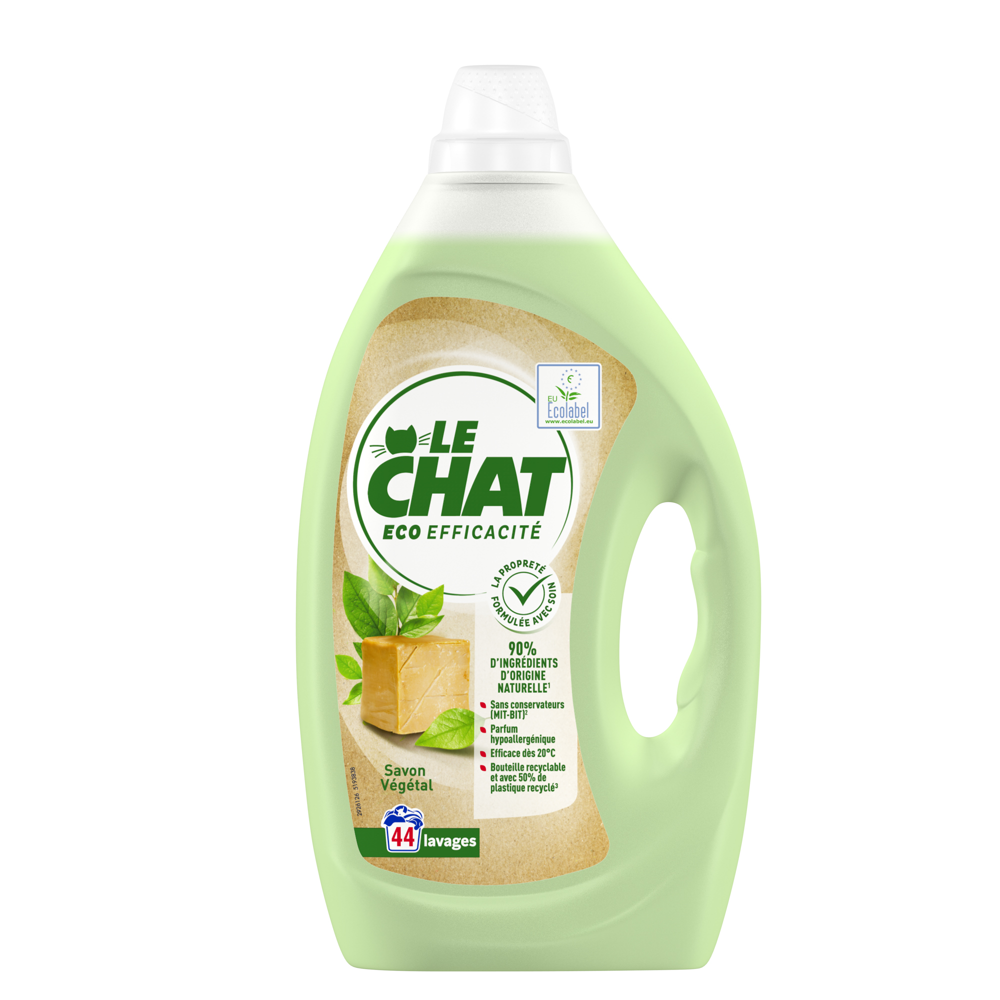 Le Chat Eco-Efficacité au Savon Végétal, vous offre une formule efficace dès 20° certifiée Ecolabel et composée à 90% d'ingrédients d'origine naturelle - le tout dans une bouteille contenant 50% de plastique recyclé