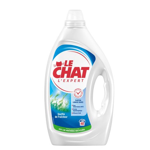 Le Chat s'engage à faire toujours mieux pour ce qui vous tient à cœur, en vous garantissant : - Toute l'efficacité Le Chat - Des ingrédients sélectionnés avec soin - Une formule sans conservateurs MIT et un parfum hypoallergénique Le Chat L'Expert Souffle de Fraîcheur, vous offre un linge impeccable même à froid et un parfum frais longue durée.