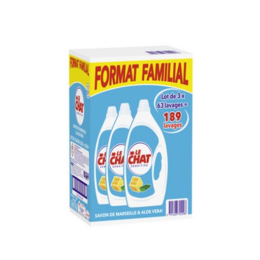 Le Chat s'engage à faire toujours mieux pour ce qui vous tient à cœur, en vous garantissant : - Toute l'efficacité Le Chat - Des ingrédients sélectionnés avec soin - Une formule sans conservateurs MIT ni BIT** et un parfum hypoallergénique (**sans BIT ajouté par le fabricant). Le Chat Sensitive au Savon de Marseille et Aloe Vera* vous garantit un linge propre tout en respectant les peaux sensibles, grâce à sa formule élaborée avec des dermatologues. (*Aloe Vera : parfum de synthèse) Lot x3