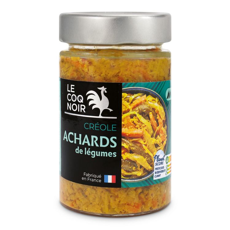 Légumes* : 50.5 % (Chou vert*, carotte*, chou-fleur*, oignon*, haricot vert*), huile de tournesol*, vinaigre d’alcool*, gingembre*, ail*, sel, épices*(1.1%).