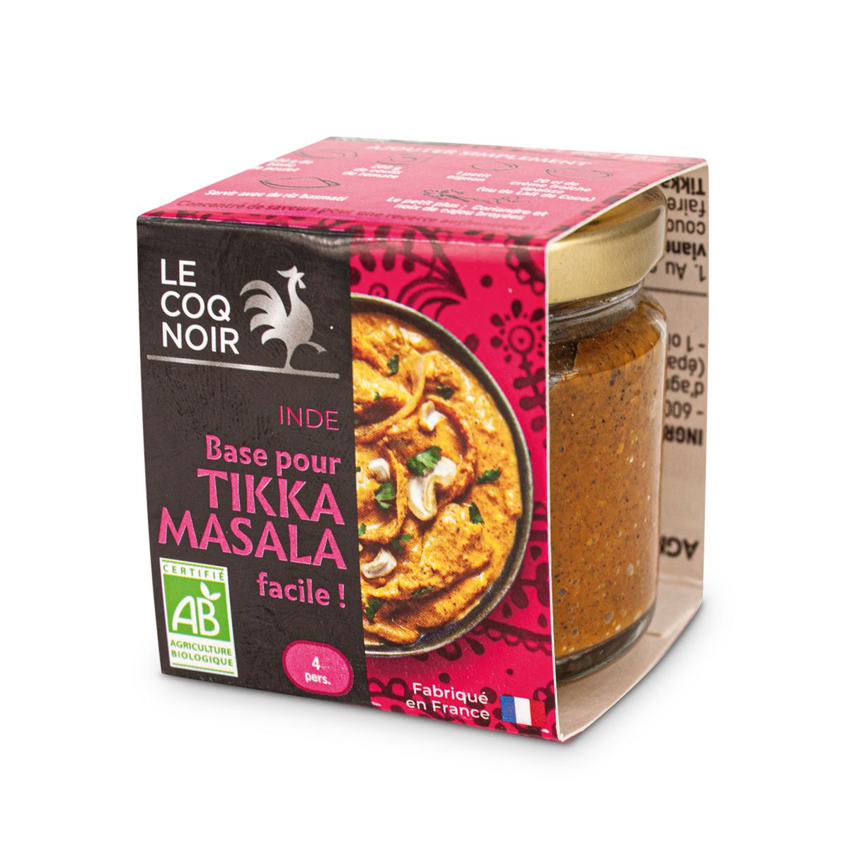 Ail*, huile de tournesol*, tomate concentrée*, oignon*, gingembre*, vinaigre d’alcool*, épices tikka masala poudre* (8% dont cumin*, coriandre*, épices* (1.5%), cannelle*, cardamone*, curcuma*), sel, jus de citron*. *Produit issu de l’agriculture biologique