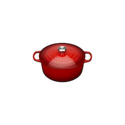 Découvrez la Cocotte Ronde Signature de Le Creuset, d'un diamètre de 28 cm et de couleur cerise. Fabriquée en fonte émaillée, elle garantit une excellente répartition de la chaleur, adaptée à tous les types de chaleur, y compris l'induction. Son couvercle hermétique retient l'humidité et les saveurs