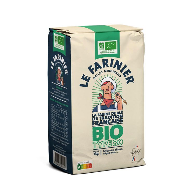 Farine T80 issue de blés cultivés et transformés en France issus de l'agriculture biologique, sans utilisation de produit chimique de synthèse conformément à la réglementation sur le mode de production biologique.