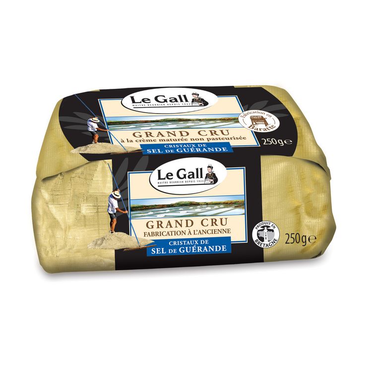 Le beurre de baratte grand cru aux cristaux de sel est issu de crème non pasteurisées. Grâce au savoir-faire de nos Maîtres Beurriers et à son processus de fabrication traditionnel (barratage tonneau), nous avons élaboré un beurre de tradition premium au goût authentique. La laiterie Le Gall fait partie des rares intervenants à maîtriser la fabrication des beurres non pasteurisés. Il faut près de 24h pour fabriquer cette recette incomparable au léger goût de noisette. Le sel de Guérande, riche en oligo-éléments est composé des cristaux blancs formés à la surface des marais salants. Elle est récoltée à la main à l'aide d'une lousse en bois et égouttée au soleil.