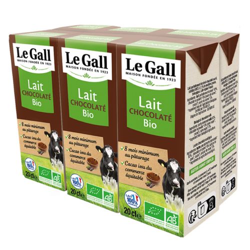 Le lait chocolaté bio Le Gall est collecté par nos soins dans des fermes bretonnes rigoureusement sélectionnées. Notre recette utilise du cacao et du sucre issus du commerce équitable et nos emballages sont certifiés FSC : le carton de nos briques est issu de forêts gérées durablement. Riche en protéines (3,3g/100ml), c'est la boisson idéale après l'effort ! Avec son emballage individuel pratique et sa paille intégrée, notre lait chocolaté est parfait pour une collation à tout moment de la journée.