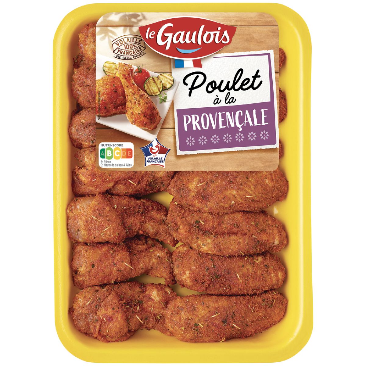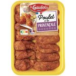 Ingrédients : Poulet origine France : 92%, marinade à la provençale : 8% (eau, huile de tournesol, épices et plantes aromatiques (dont ail : 0.01%), semoule de riz, sel, tomate : 0.2%, poivron, betterave rouge, arômes, arômes de fumée, sucre, huile d’olive : 0.09%, sarriette, romarin, marjolaine, thym, sauge, extraits d’épices, correcteurs d’acidité : lactate de calcium et acétate de sodium). Traces possibles de gluten et lait.