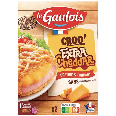 Pour les fans de fromage, Le Gaulois vous propose un croq ultra-gourmand avec 2 fois plus de fromage ! Une généreuse tranche de cheddar fondu, associé à une tranche de jambon de dinde et pour plus de gourmandise, du cheddar râpé sur le dessus de la chapelure.