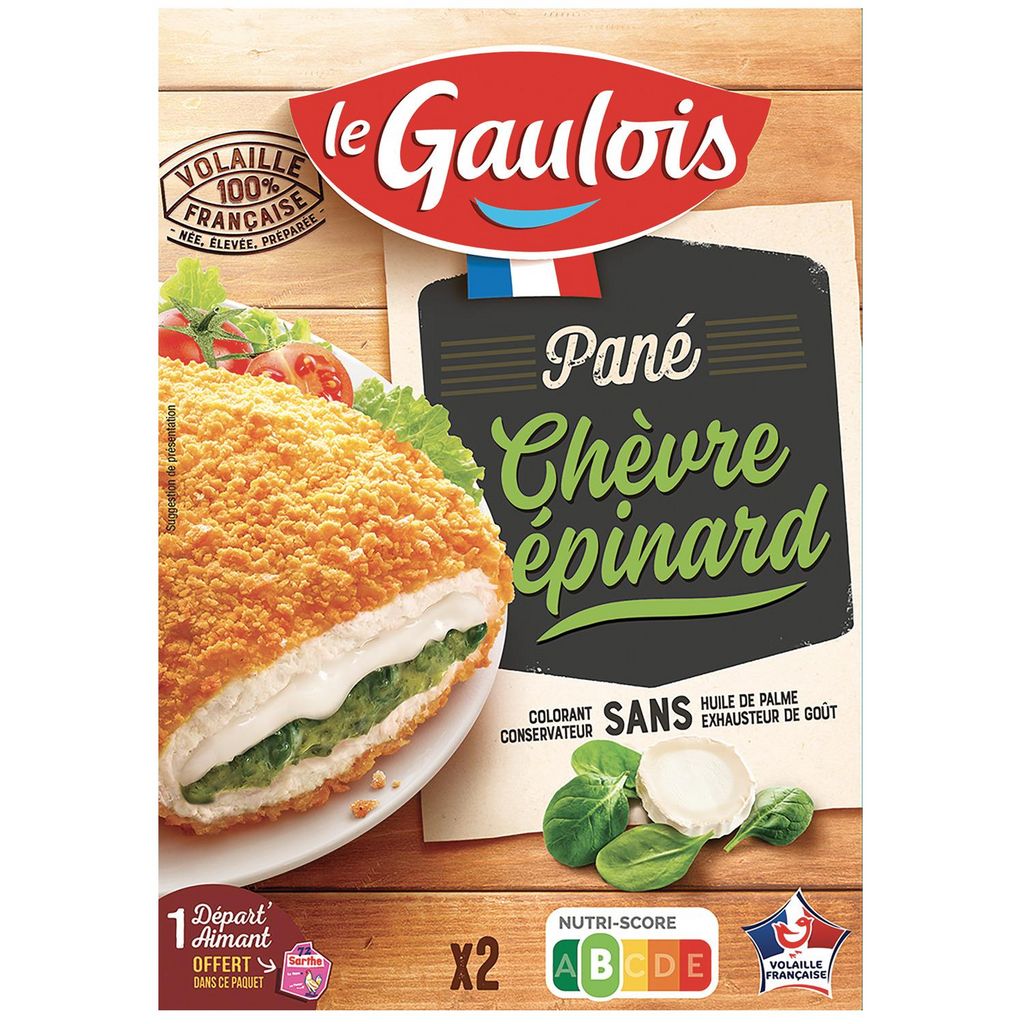 Un pané avec des épinards associés à un chèvre fondant pour plus de gourmandise. Une volaille 100% française et une recette sans conservateur, sans colorant et sans exhausteur de goût.