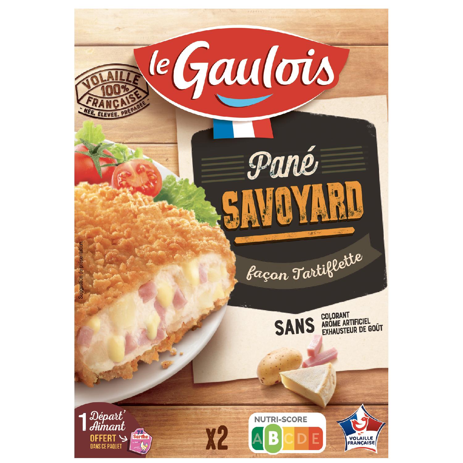 Ingrédients : Préparation à base de pomme de terre, de REBLOCHON fondu, de jambon de dinde fumé et d’oignons : 72% (pommes de terre cuites : 21%, REBLOCHON fondu : 15% (REBLOCHON : 9,5%, BEURRE, eau, amidon modifié de pomme de terre, sels de fonte : citrates de sodium, gélifiant : carraghénanes), viande de poulet : 13%, FROMAGE blanc, jambon de dinde cuit standard fumé : 6.8% (viande de dinde : 5.4%, eau, fibre de BLÉ, dextrose, protéine de BLÉ, sel, arômes naturels, ferments, gélifiant : carraghénanes), fibre de BLÉ, plantes aromatiques (oignon : 1.2%), sel, vin blanc), panure : 28% (farine de BLÉ, eau, sel, levure). Huile de tournesol. Peut contenir des traces d’œuf et de soja.