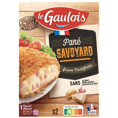 Ingrédients : Préparation à base de pomme de terre, de REBLOCHON fondu, de jambon de dinde fumé et d’oignons : 72% (pommes de terre cuites : 21%, REBLOCHON fondu : 15% (REBLOCHON : 9, 5%, BEURRE, eau, amidon modifié de pomme de terre, sels de fonte : citrates de sodium, gélifiant : carraghénanes), viande de poulet : 13%, FROMAGE blanc, jambon de dinde cuit standard fumé : 6.8% (viande de dinde : 5.4%, eau, fibre de BLÉ, dextrose, protéine de BLÉ, sel, arômes naturels, ferments, gélifiant : carraghénanes), fibre de BLÉ, plantes aromatiques (oignon : 1.2%), sel, vin blanc), panure : 28% (farine de BLÉ, eau, sel, levure). Huile de tournesol. Peut contenir des traces d’œuf et de soja.