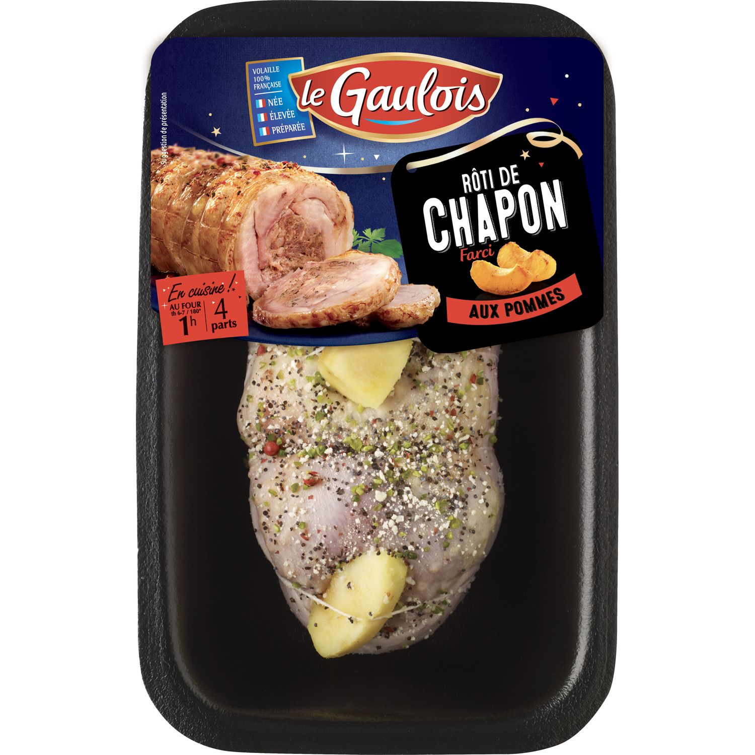 le gaulois 600g rôti chapon pommes 100% transparence, 100ù fraicheur, 100% qualité. Le Gaulois offre une gamme complète de rôtis farcis frais, assemblés à la main. La farce gourmande aux pommes du Val de Loire est traduite sur le rôti par de véritables morceaux de pomme. Une alliance sucré/salé pour un repas de fête