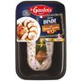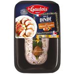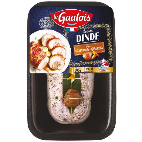Ingrédients : Cuisse de dinde désossée avec peau saumurée : 66.8% (cuisse de dinde désossée avec peau origine France : 63%, eau, sel, extraits d'épices, correcteurs d'acidité : lactate de calcium, acétates de sodium), farce aux marrons et aux girolles cuits : 23.5% (marrons : 54%*, eau, oignons, oignons préfrits (oignons, huile de tournesol), girolles : 5%*, pleurote, flocons de pommes de terre déshydratés, ail, sel, sucre, poivre blanc), barde de porc : 7.8%, marrons cuits : 1.2%, girolles (girolles déshydratées, eau) : 0.1%, laurier, chapelure de riz et de maïs (farine de riz et de maïs, amidon, sel, dextrose), épices (baie rose, poivre), petit pois, graine de pavot bleu.