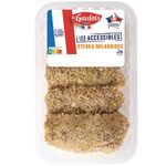 Ingrédients : haut de cuisse de dinde sans os sans peau tranché origine France : 81%, panure : 14% (farine de blé (dont carbonate de calcium, fer, niacine, thiamine), eau, sel, levure), eau, sel, extraits d’épices, correcteurs d’acidité : lactate de calcium, acétate de sodium. Traces possibles de lait et œuf.