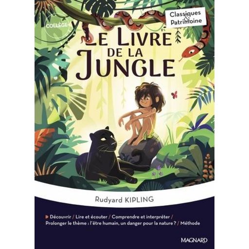 Les nouvelles : Tandis que dans la Jungle, Mowgli, le petit d'homme, est élevé par les loups sous la protection de Baloo et Bagheera, Kotick le phoque blanc explore les mers à la recherche d'un lieu inaccessible aux humains qui massacrent son peuple.Pendant ce temps, la mangouste Rikki-tikki livre un combat acharné contre Nag et Nagaina, deux méchants cobras , Petit Toomai rêve de voir danser les éléphants , et chameaux, éléphants, chevaux, boeufs et mulets échangent sur leurs peurs et leurs fiertés.A travers les sept nouvelles du Livre de la Jungle, Kipling invite le lecteur à voyager et à rêver, mais aussi à réfléchir à la place de l'être humain dans la nature. Les objets d'étude : Récits d'aventure (alte de 6e) Le voyage et l'aventure : pourquoi aller vers l'inconnu ? / L'être humain est-il maître de la nature ? (alte de 5e) L'accompagnement pédagogique : Une présentation visuelle et accessible pour découvrir l'auteur, l'époque et le genre de la nouvelle Les sept nouvelles et des extraits audio Des séances d'étude de l'oeuvre avec des questions, des encadrés sur les grandes notions littéraires et des activités variées Un groupement de textes et d'images pour prolonger le thème : l'être humain, un danger pour la nature ? Un bilan pour retenir l'essentiel Méthode : des fiches simples et efficaces pour travailler ses compétences