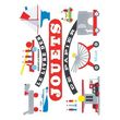 Ce nouveau pop-up de Gérard Lo Monaco s'ouvre comme un coffre à jouets . A l'intérieur : un voilier à bassin, un camion à six roues, un éléphant à roulettes, un camion de pompiers etc. L'enfant qui jouerait avec eux, articule un récit où chacun trouve sa place et qui se termine dans une chambre en j