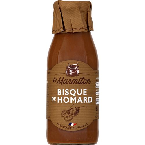Ingrédients : Eau, POISSONS, concentré de HOMARD 6% (équivalent à 18% de HOMARD), concentré de tomates, amidon modifié, crème (LAIT), oignons, sel, carottes, huile de colza, vin blanc, arôme, épices, fine de bourgogne.