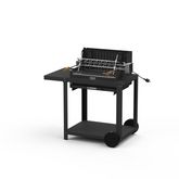 Foyer horizontal avec une grille inox 54*32 cm réglable sur 3 niveauxFoyer vertical avec un tournebroche inox, un moteur électrique force 10 kg (2t/min) et une broche anglaise6 à 10 couvertsCuve et tiroir à cendres en acier peinture époxy coloris noirFonctionne au charbon de bois uniquementChariot a