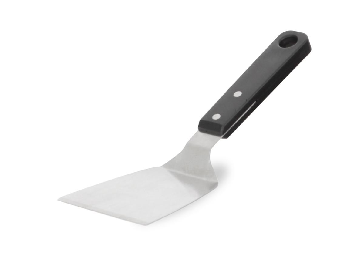 En inox. Indispensable pour manipuler ses aliments lors de la cuisson à la plancha. Peut être suspendue.