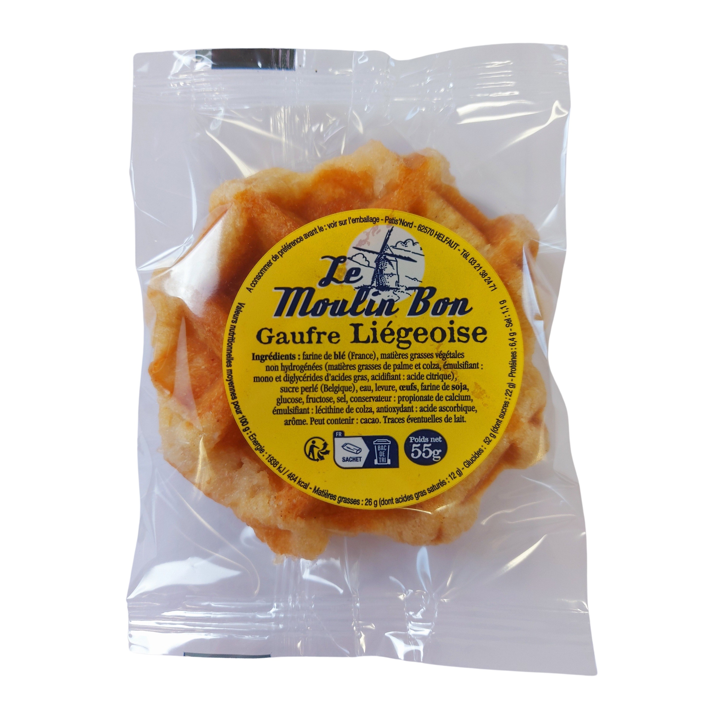 Farine de BLE (France), matières grasses végétales non hydrogénées (matières grasses de palme et colza, émulsifiant : mono et diglycérides d'acides gras, acidifiant : acide citrique), sucre perlé 21%, eau, levure, OEUFS, farine de SOJA, glucose, fructose, sel, conservateur : propionate de calcium, émulsifiant : lécithine de colza, antioxydant : acide ascorbique, arôme. Traces éventuelles de lait.